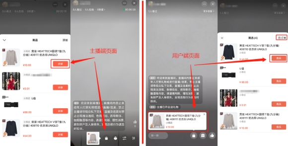 商品添加完成后,即可开始直播,点击【讲解】,即可针对该商品进行讲解,用户端会显示该商品,点击即可在直播间进行购买;