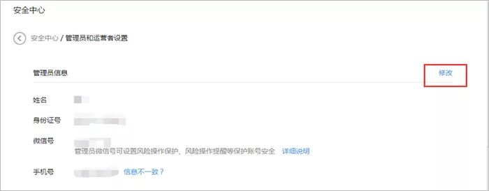 目前企业类等公众号可通过验证管理员微信号,修改身份证/手机号。