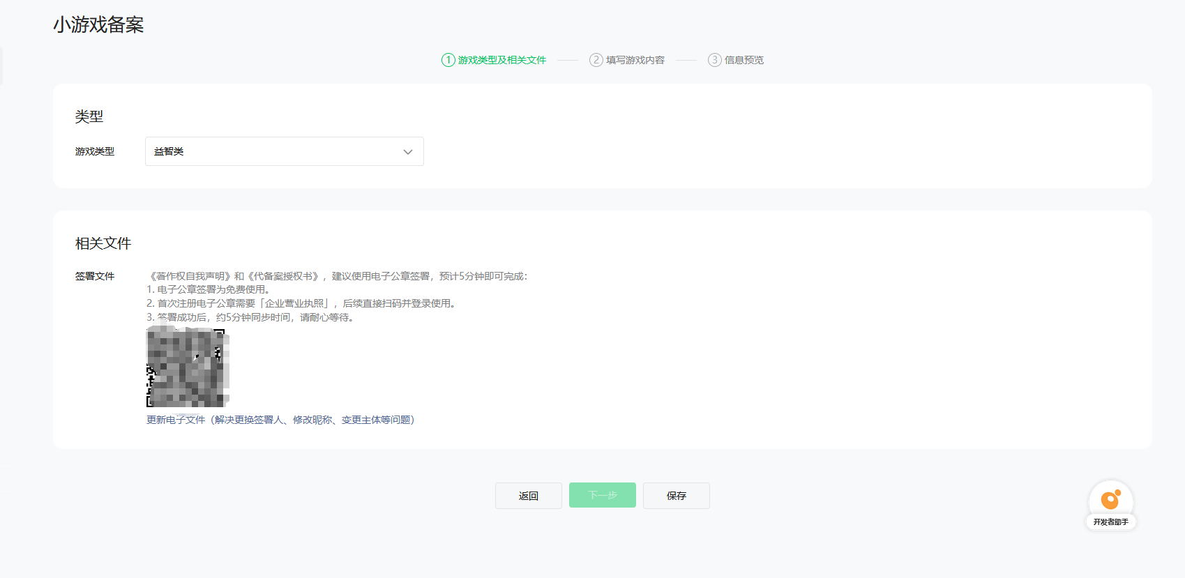 跳到腾讯电子签先完成游戏企业实名和电子印章生成,然后在腾讯电子签里面完成小游戏文件盖章就可以啦,文件阅读、签署全流程闭环在电子签,签好后电子签会自动把盖章件回传给小游戏的