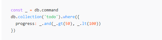 const _ = db.command db.collection('todo').where(_.and([ { progress: _.gt(50) }, { tags: 'cloud' } ])).get()
