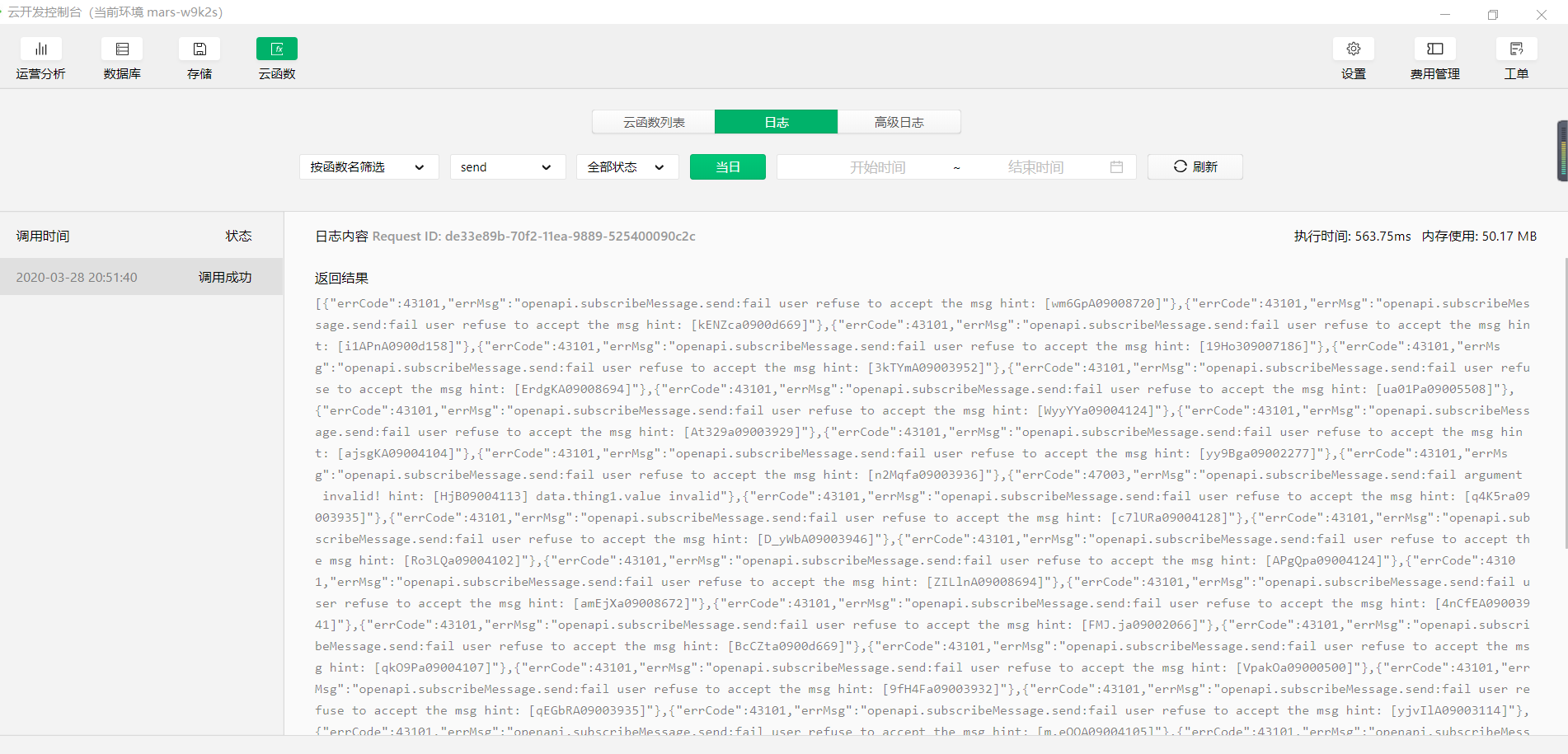 {"errCode":43101,"errMsg":"openapi.subscribeMessage.send:fail user refuse to accept the msg hint: [IDW3lA0906hb56]"}