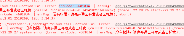 小程序A创建了云环境cloud1,然后A把这个云环境cloud1共享给了小程序B,B在运行的时候一直报错errCode: -601034。