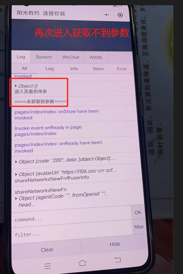 描述:本身小程序上是携带的参数的,如果第一次点击小程序是可以通过页面中的onLoad(options)获取到的。如果通过这种方法打开后,再次通过点击链接进入参数就获取不到了, 而把进程里的当前小程序杀死,再点击链接进入参数就是可以拿到的