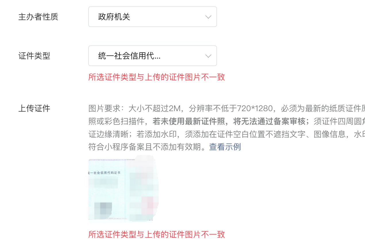 提交的材料为统一社会信用代码证书,一直提示上传图片不一致,无法进行备案。