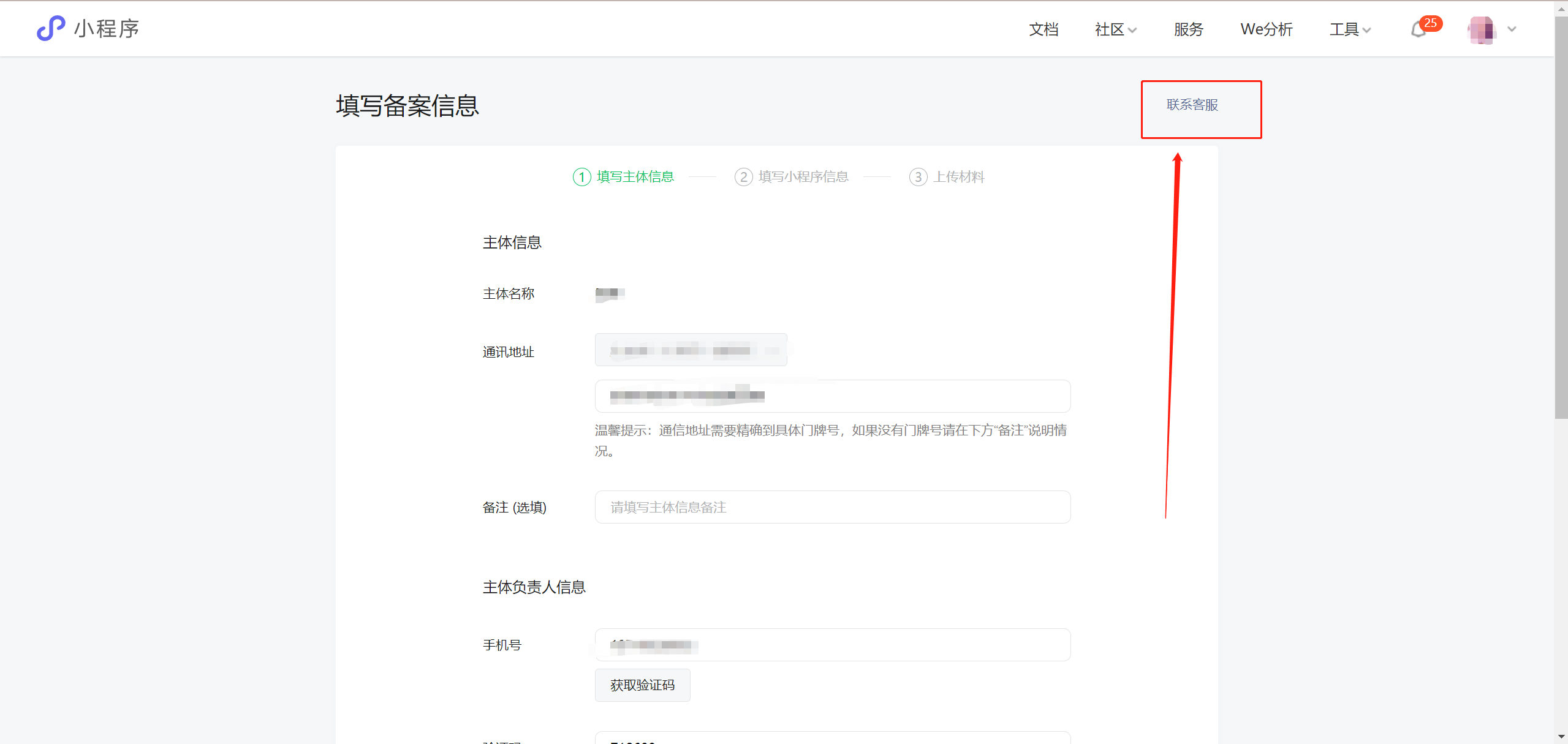 备案流程页面右上角会有客服入口。