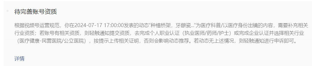 公司是义齿加工厂,分享的工厂日常视频被提示上述内容。准备提交资质的时候发现从属行业类型中没有符合的,怎么办。客服也没地方找。