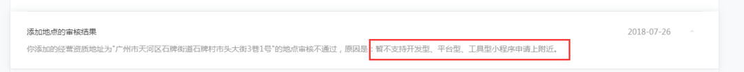 我的小程序无法在附近小程序中展现,我也有申请添加位置,但是提示失败,原因是暂不支持开发型,平台型,工具型小程序申请上附近,我想了解一下是我给过来的资料不够详细需要提供什么资料?还是其他什么原因?类似这种原因有什么办法可以解决?有没有更详细一点的处理意见与建议?