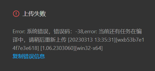 message:Error: 系统错误,错误码:-38,error: 当前还有任务在编译中,请稍后重新上传 [20230313 13:45:44][wxb53b7e14f7e3e618]