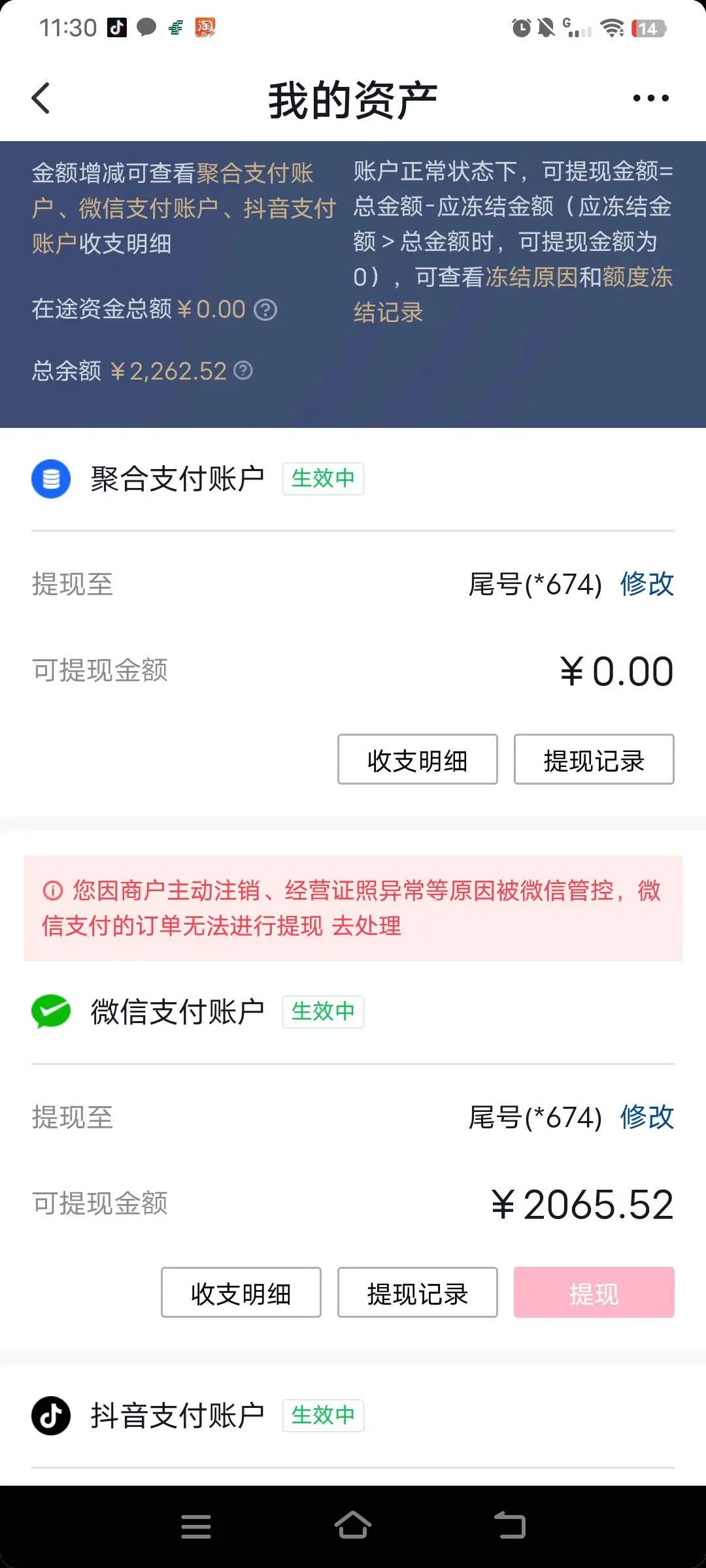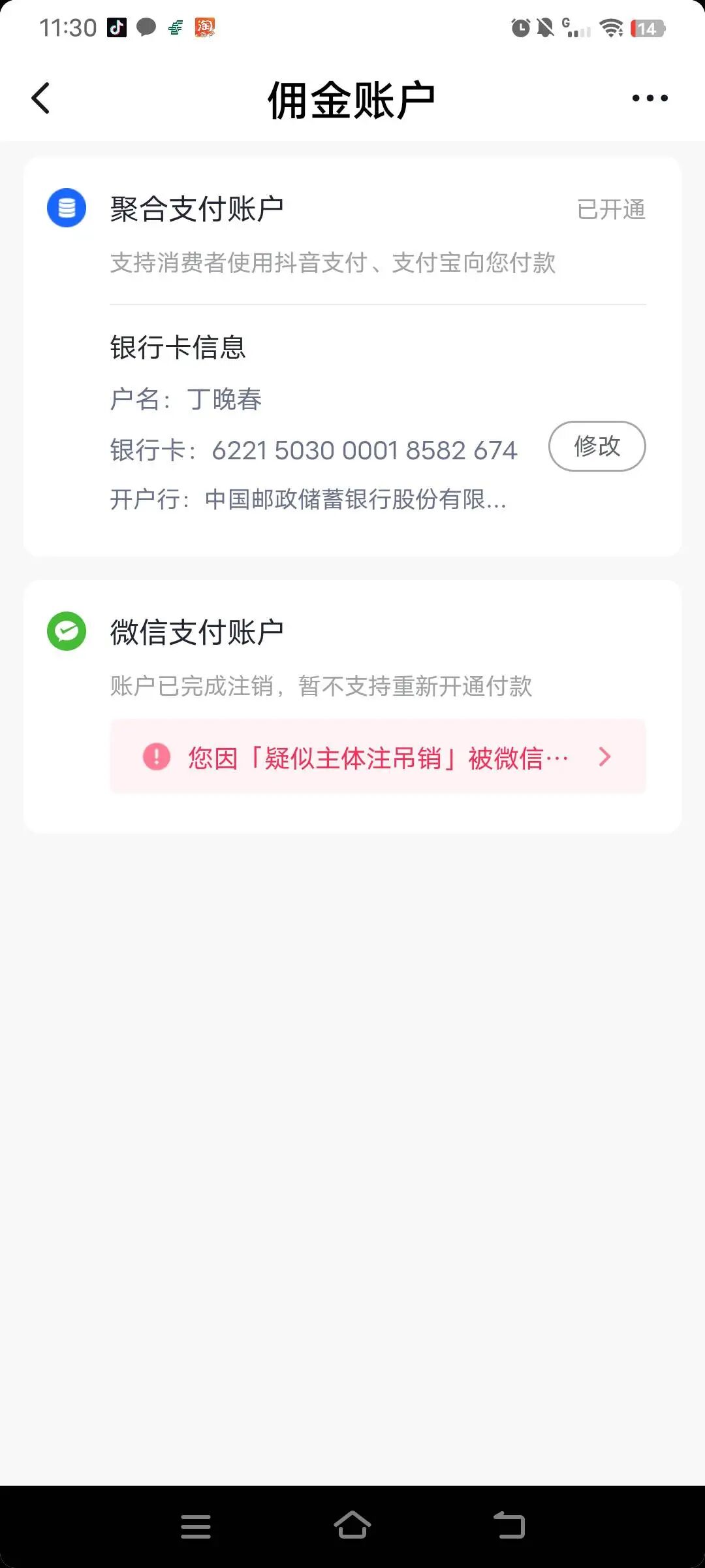 我是抖音电商平台的带货达人,因为我抖音平台的小店关闭了,所以营业执照也注销了,微信提示我被微信平台管控哦不过了,我的佣金结算受也限制了,还有我的微信支付账户去年为了提现根据提示给注销了,快一年了微信支付账户里都没结算过一分钱了,我想知道我的拥金到底结算到哪里去了😭