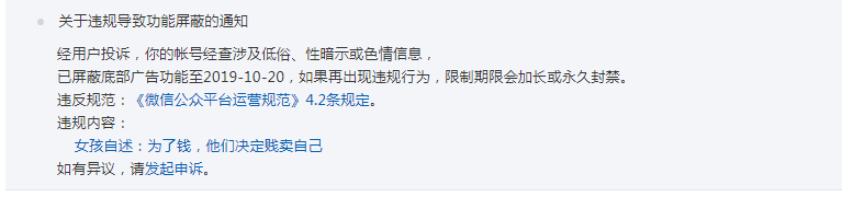经用户投诉,你的帐号经查涉及低俗、性暗示或色情信息, 已屏蔽底部广告功能,这样会扣除上个月流量主吗?