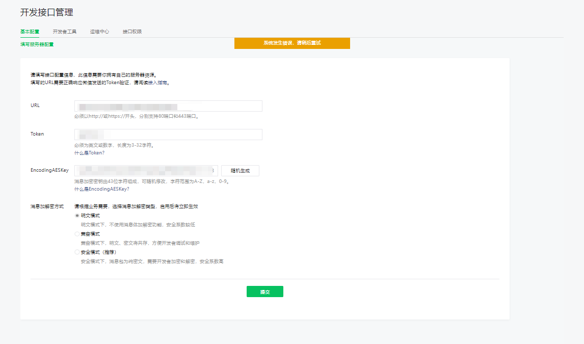 2、公众号基础配置提示“系统错误,请稍后重试”可以参考知识库排查下:https://developers.weixin.qq.com/community/develop/doc/00086e39588df08d45b1c7ef76b009