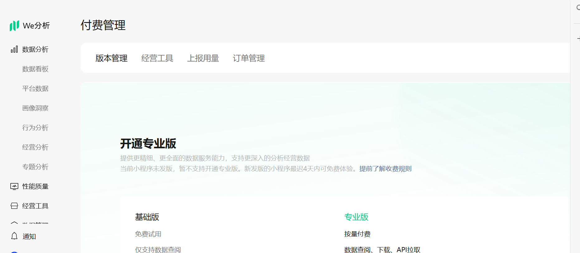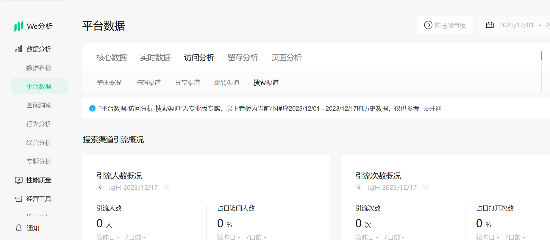 WE分析访问分析-搜索渠道没有数据,不是可以免费使用1年吗?也没有专业版本购买按钮入口,请帮我们看看是什么BUG,感谢。小程序APPID:wxf683ca433b38666a、wx84eff2e805810c8a、wx4b95707cb42f564c
