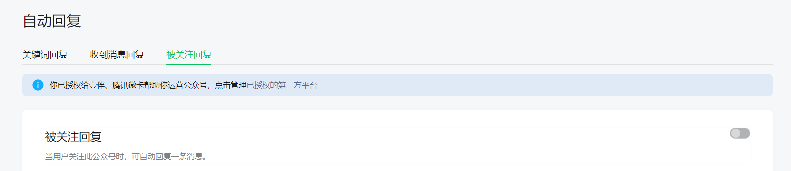 如果已授权给第三方平台(如135平台、星耀裂变、壹伴等)来帮助运营公众号,这些平台可能会接管自动回复设置,导致在公众号后台无法直接编辑。请检查并管理已授权的第三方平台,确保它们没有限制你的编辑权限。
