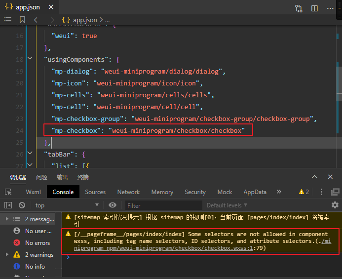 weui的mp-checkbox如果在app.json进行全局注册,会引发警告 Some selectors are not allowed in component wxss, including tag name selectors, ID selectors, and attribute selectors.(./miniprogram_npm/weui-miniprogram/checkbox/checkbox.wxss:1:79