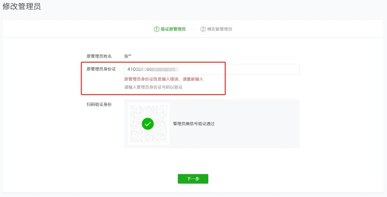 管理员微信号验证通过了,但是 原管理员身份证 号 怎么都通过不了,把 可能 姓 张的 员工 试了一遍 都不行,管理员微信号上的实名认证人的身份证号 也试了还是不行,请问大家或小程序运营专员