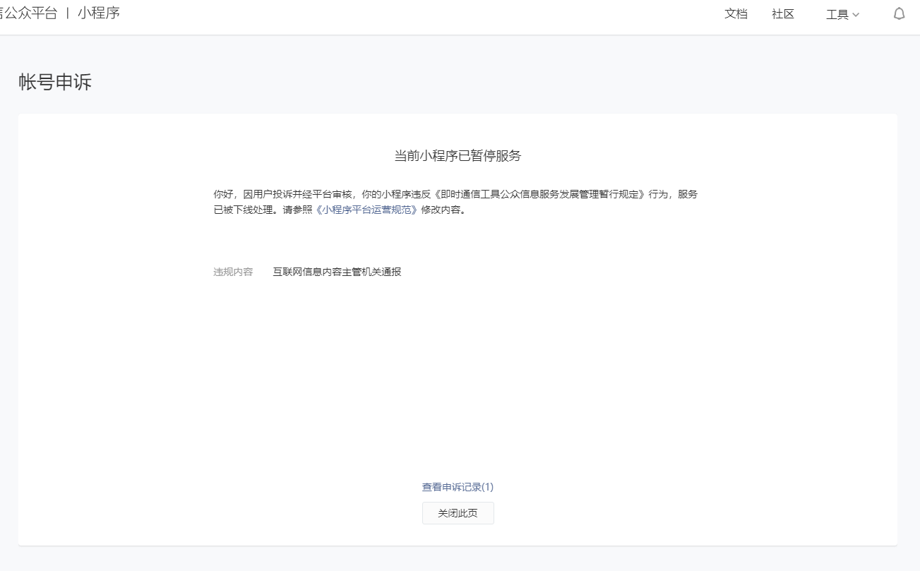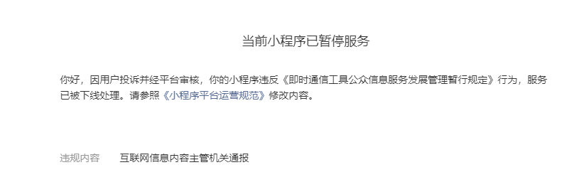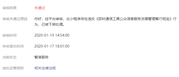 2020-01-17 18:01:00 提交了申诉,结果为:你好,经平台审核,此小程序存在违反《即时通信工具公众信息服务发展管理暂行规定》行为,已被下架处理。