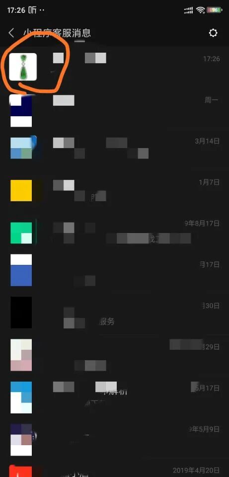 第二步:然后离开小程序,但小程序在后台还是运行的,从微信客户端找到客服消息,点进去,再次点击前面发送的产品链接,出现 页面不存在,