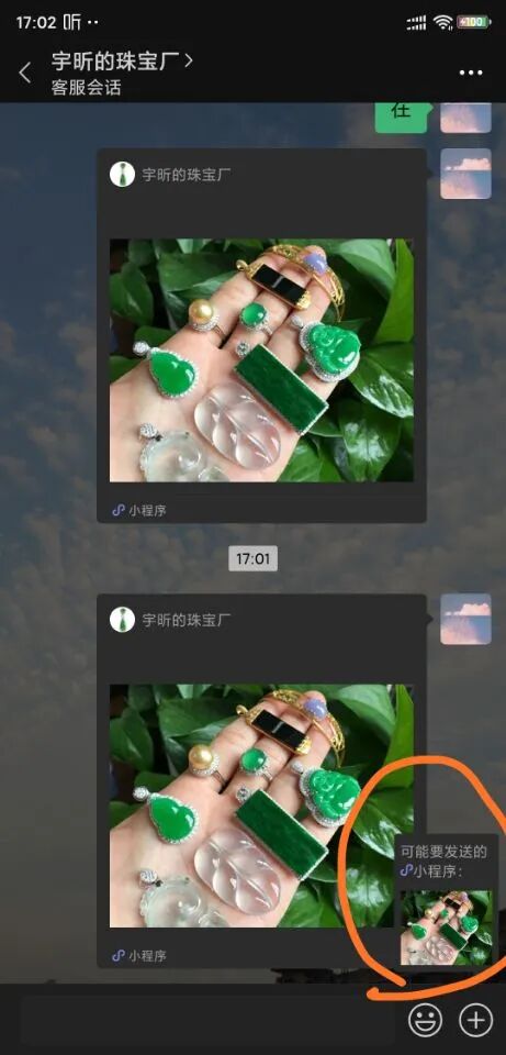 此小程序(宇昕的珠宝厂)已经上线,帮忙解决问题的大佬可以复现下此问题,复现步骤为: ①从小程序进商品详情 - 客服 ②发一个产品连接给客服 接下来的就是和上面一样的操作啦。