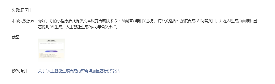 我明明非常清楚的在上面标注:本解答为AI生成内容,仅供参考!原来审核都通过了,现在就是不给通过,问怎么修改,又不说,反正就是不通过!你要是明说,你说咋改就咋改也可以呀!只是机械重复:你好,你的小程序涉及提供文本深度合成技术 (如: AI问答) 等相关服务,请补充选择:深度合成-AI问答类目,并在AI生成页面增加显著说明“AI生成、人工智能生成”或同等含义字样。