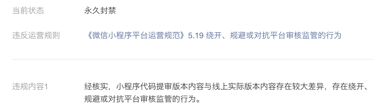 我们小程序因为被判定提审版本和线上版本不符,直接被永久封禁了,申诉了也不给通过!