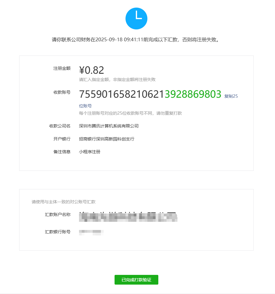 你们财务打款成功后,打款信息正确就会在一个工作日内收到【通知中心】的站内信通知,提示验证主体成功。超过1个工作日未收到,就代表你们财务打款信息与你截图的不一致。找你们财务要打款回执单,自己一个字一个字的对比排查。