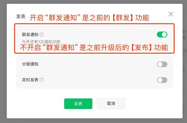 关闭【群发通知】是之前升级后的发布功能,不会推送给粉丝,有可能获得平台推荐,不占用群发次数,但是会展示在公众号主页上面。(目前发布没有次数限制)