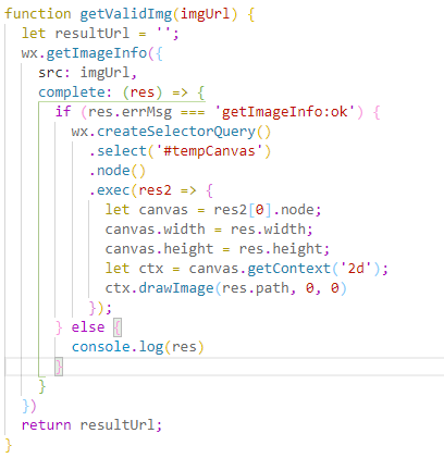 // 加载函数 function loadImage(canvas,src) { return new Promise((resolve,reject) => { const img = canvas.createImage(); img.onload = () => { resolve(img); }; img.onerror = (e) => { reject(e); }; img.src = src; }); }; // 使用时 loadImage(canvas,fileUrl) .then((img)=>{ let ctx = canvas.getContext('2d'); ctx.drawImage(img, 0, 0,100,100) });