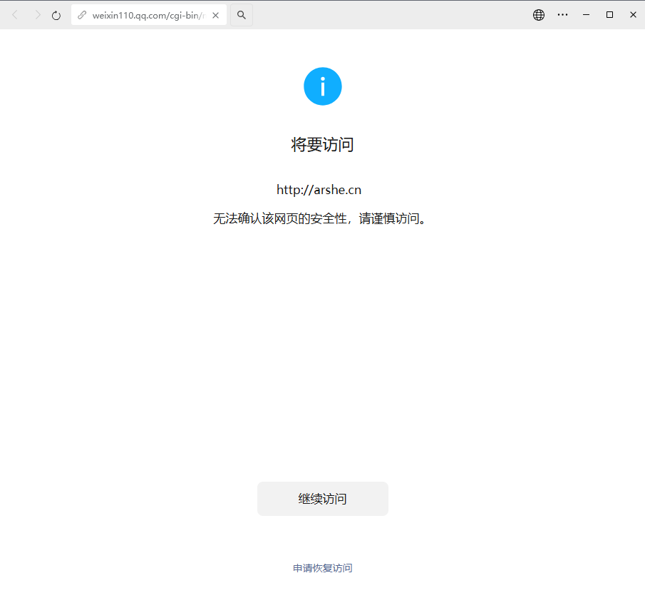 尊敬的微信开发社区管理员,本人域名:arshe.cn。 刚建网站,在微信点了几下就出现了拦截:继续访问,被拦截。