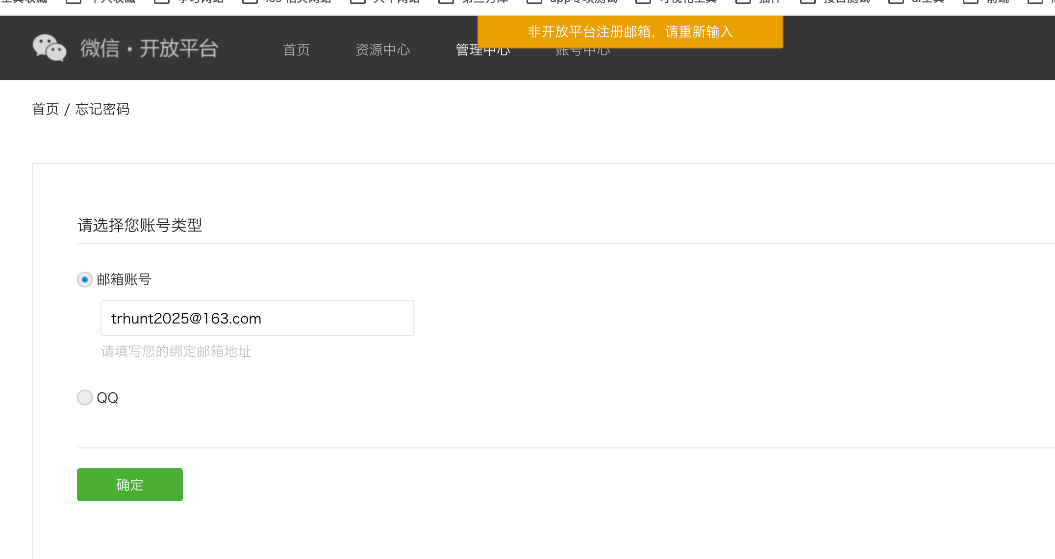 你这个邮箱被公众号注册了,就不能用来注册微信开放平台,重新注册新邮箱就行了