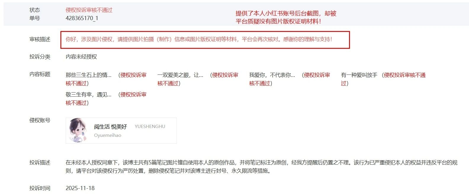 本人多次遭到微信公众号博主盗图侵权,经提醒后对方仍置之不理、持续侵权,无奈之下只能通过平台侵权投诉流程维权。投诉一,我提交了创作底稿、原图等核心证据,却被平台以 “未提供账号登录状态,无法核实你为相关投诉权利人” 为由驳回(已提供个人身份证等信息);投诉二,我提交了本人小红书账号后台截图等佐证,又被以 “需提供图片拍摄(制作)信息或图片版权证明等材料” 驳回!