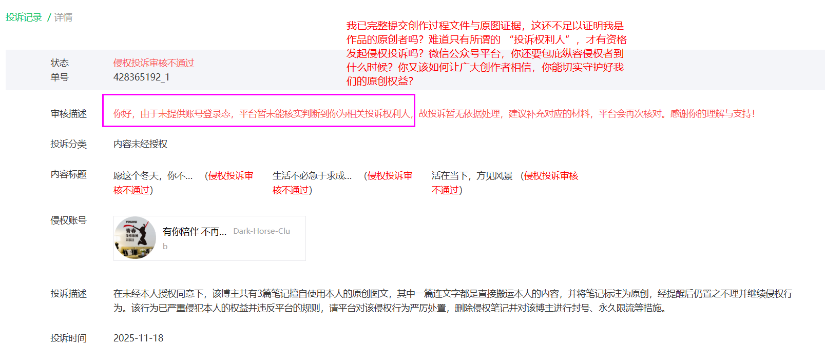 投诉驳回一:创作者手握原图 + 创作底稿,微信公众号却不护原创?质问平台底线!