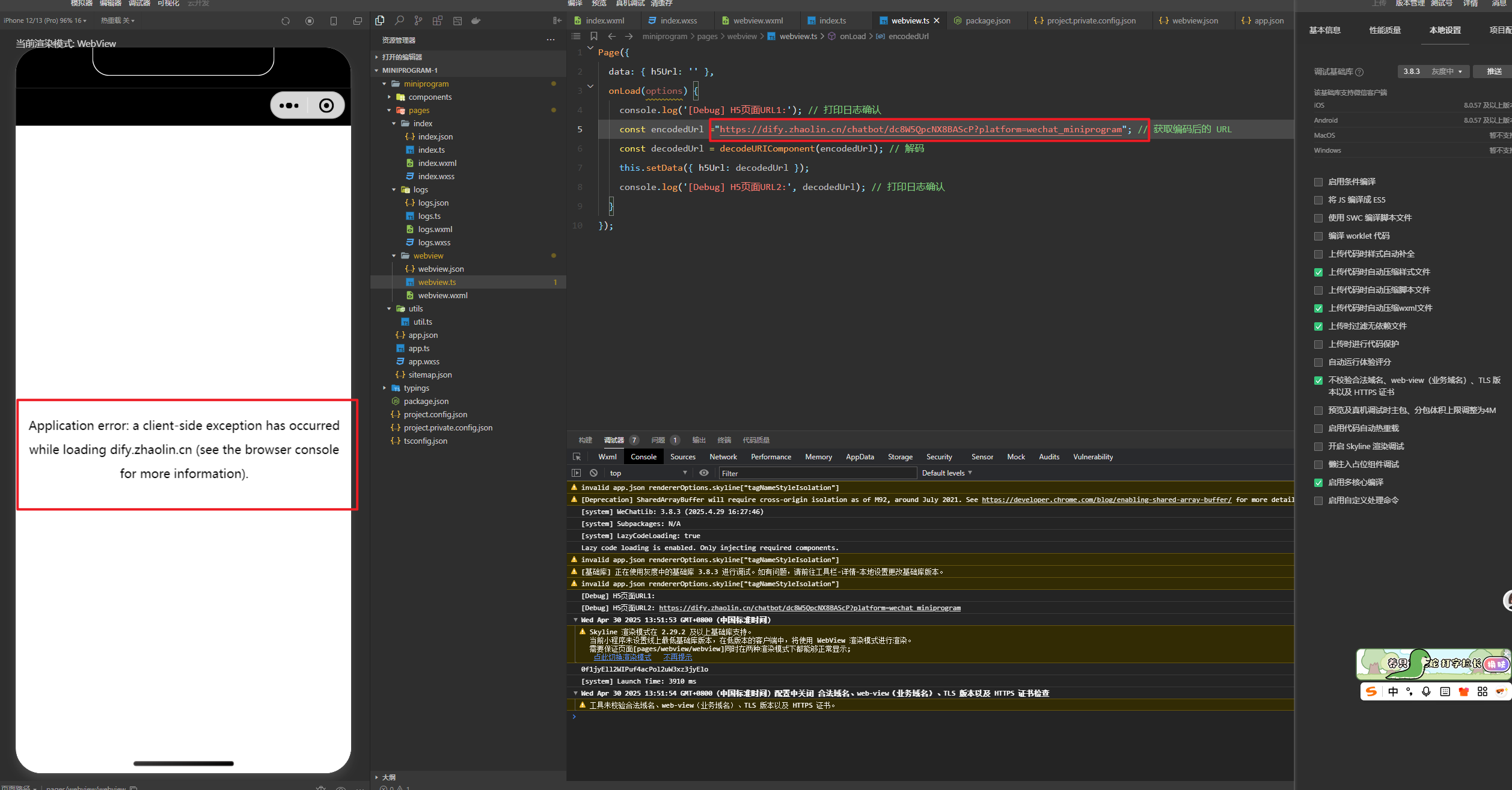 请问这个链接在微信里和浏览器里打开都正常 , 唯独在小程序打开报错 怎么解决 怎么看具体的报错信息呢