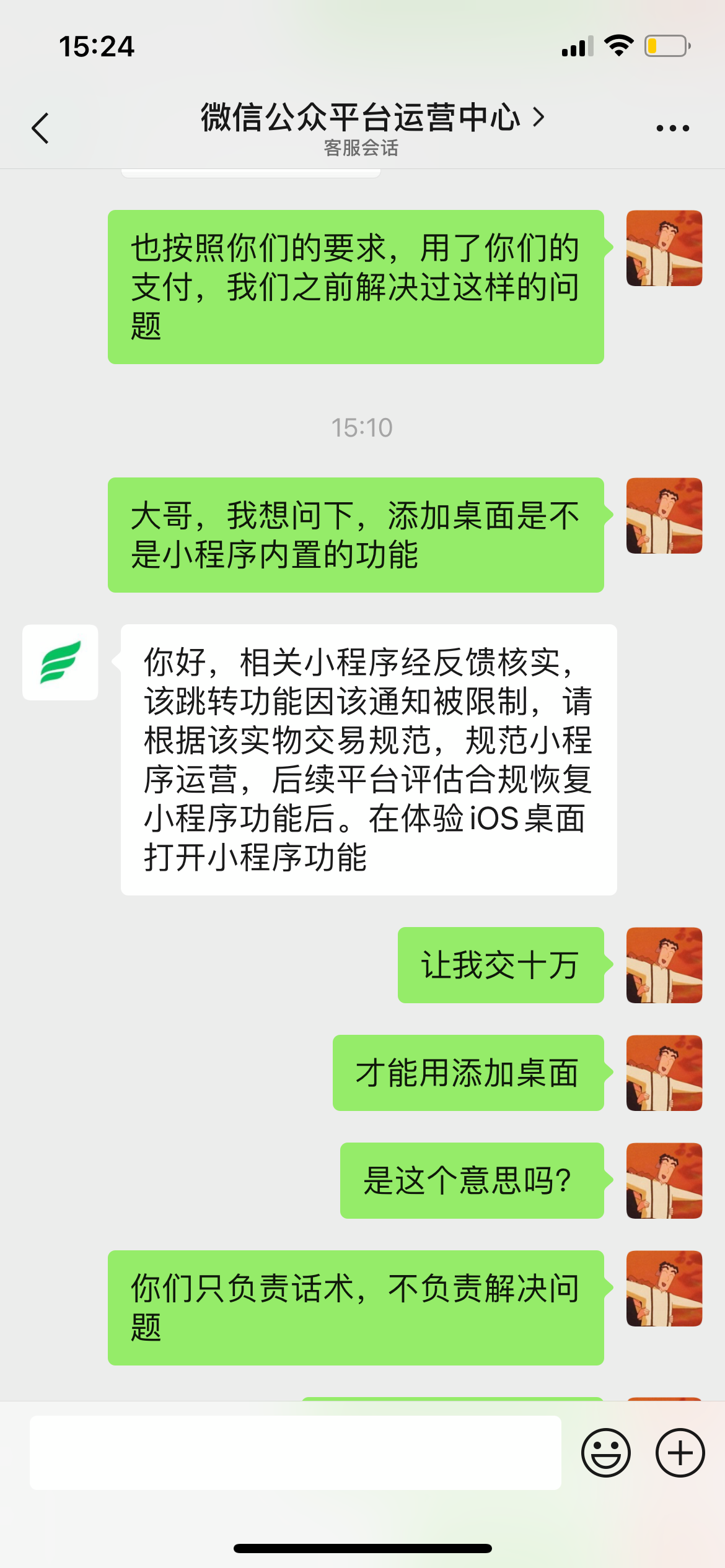 找客服,客服的意思是让交10万的保证金才可以用IOS添加到桌面的功能,不涉及三方跳转,仅仅只是添加桌面,客服就是这样解决问题的?的?