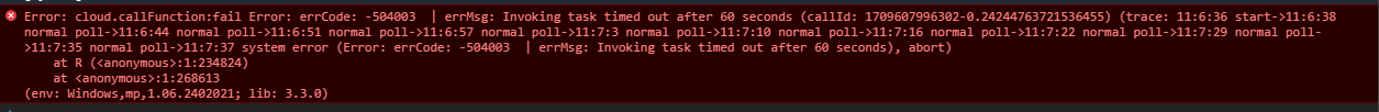 超时了。云函数运行超过了3秒。去修改这个超时时限,改大点,比如60秒。