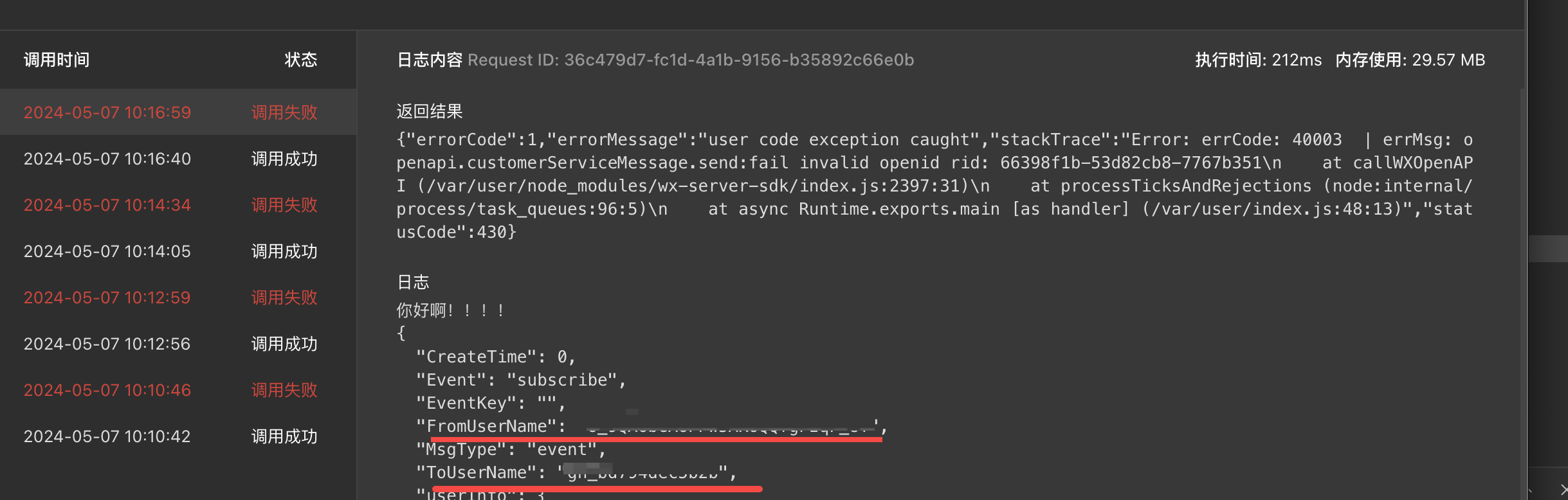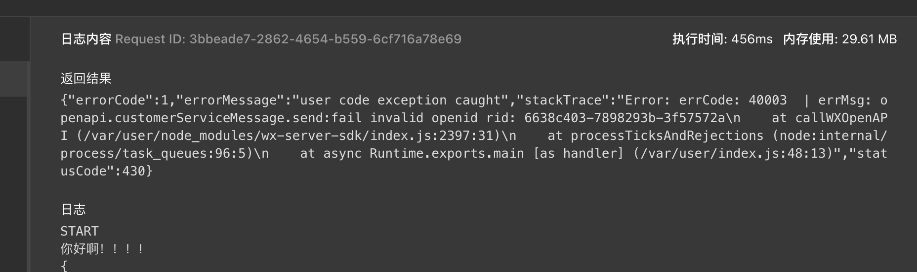 {"errorCode":1,"errorMessage":"user code exception caught","stackTrace":"Error: errCode: 40003 | errMsg: openapi.customerServiceMessage.send:fail invalid openid rid: 6638c403-7898293b-3f57572a\n at callWXOpenAPI (/var/user/node_modules/wx-server-sdk/index.js:2397:31)\n at processTicksAndRejections (node:internal/process/task_queues:96:5)\n at async Runtime.exports.main [as handler] (/var/user/index.js:48:13)","statusCode":430}