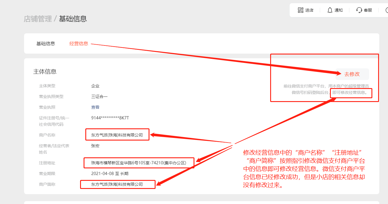 公司变更了企业名称,银行对应变更了账户名称,微信支付商户对应的变更了相关信息,唯独小商店这边变更不过来。按照小商店里经营信息指引,只要在微信支付商户里变更就可以完成经营信息变更,但是就是变更不过来。难道小商店就报废了么?
