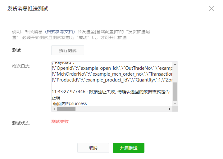 2、虚拟支付2.0 -> 基本配置 -> 直购配置 -> 道具发货推送 -> 开启推送 -> 发货消息推送测试 -> 执行测试 ,必然失败,因为查看推送日志里面,根本没有传echostr字段,所以返回也会为空,导致测试失败,就没办法开启推送,其他三个字段signature、timestamp和nonce都是有的,请问是什么原因