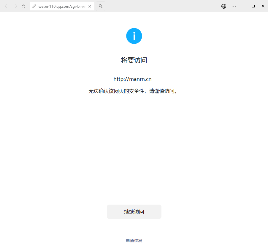 尊敬的微信开发社区管理员,本人域名:manrn.cn。刚建立个人网站,在微信点了几下就出现了拦截:继续访问,被拦截。