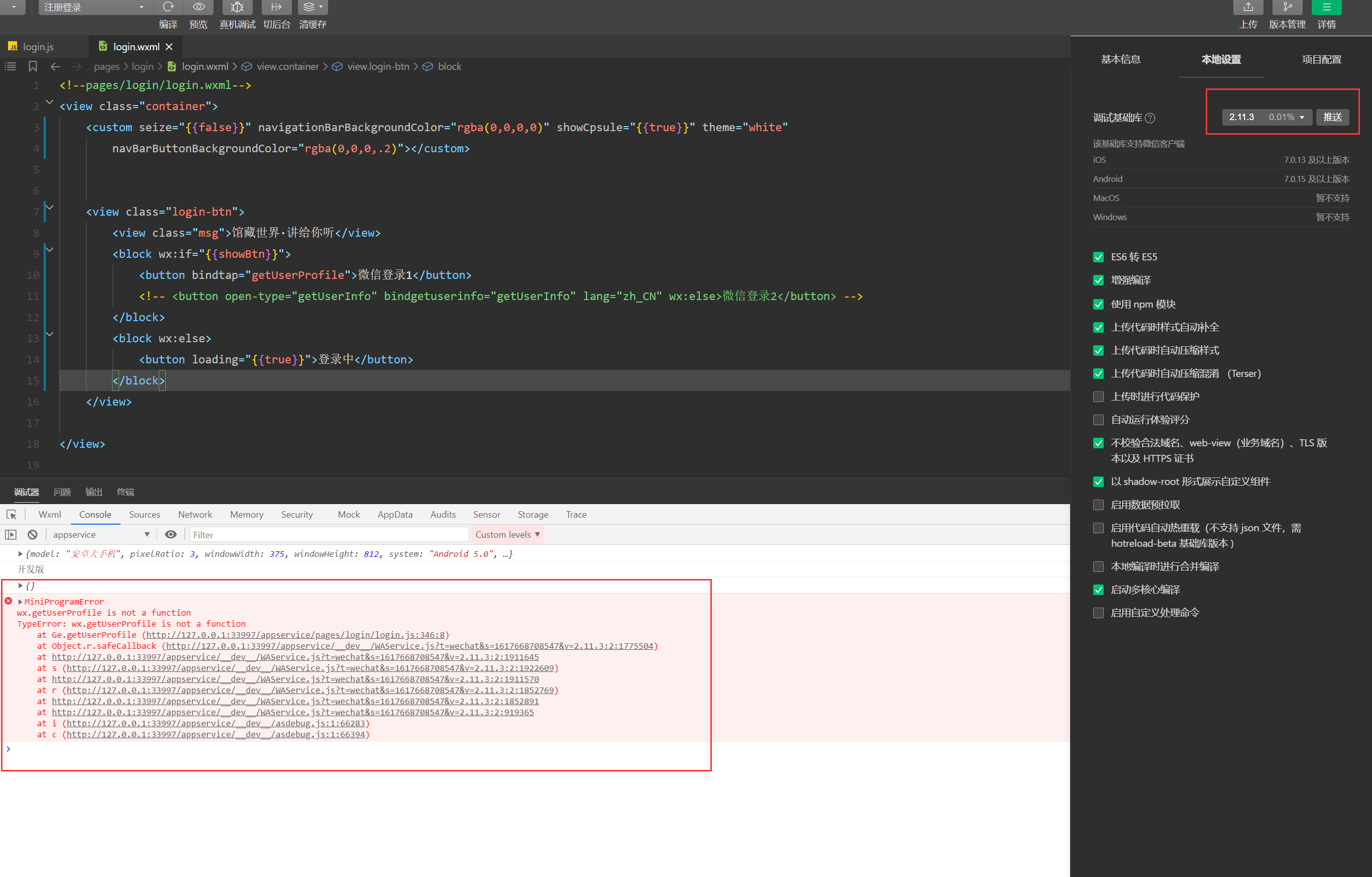 开发者工具里模拟2.11.3及以下 提示方法不存在