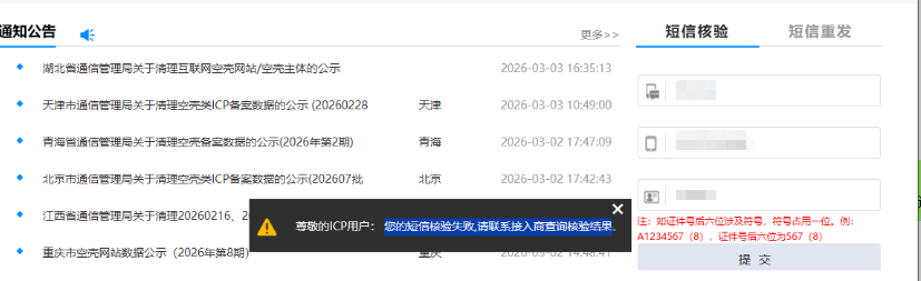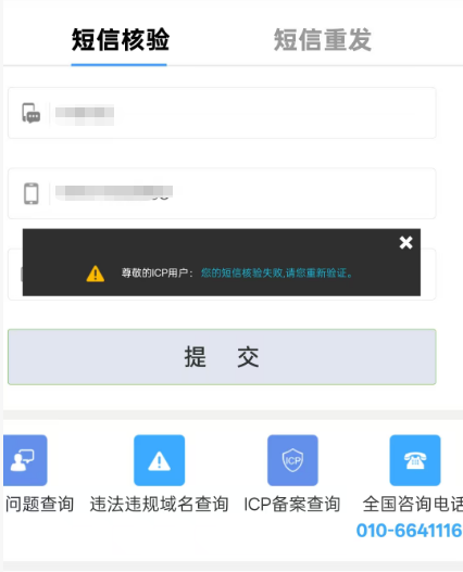 验证后先提示短信验证失败后面又提示说请联系接入商查询结果