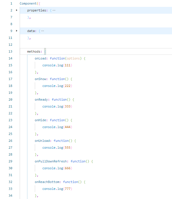 lifetimes: { // 生命周期函数,可以为函数,或一个在methods段中定义的方法名 attached: function () { }, moved: function () { }, detached: function () { }, }, // 生命周期函数,可以为函数,或一个在methods段中定义的方法名 attached: function () { }, // 此处attached的声明会被lifetimes字段中的声明覆盖 ready: function() { }, pageLifetimes: { // 组件所在页面的生命周期函数 show: function () { }, hide: function () { }, resize: function () { }, },