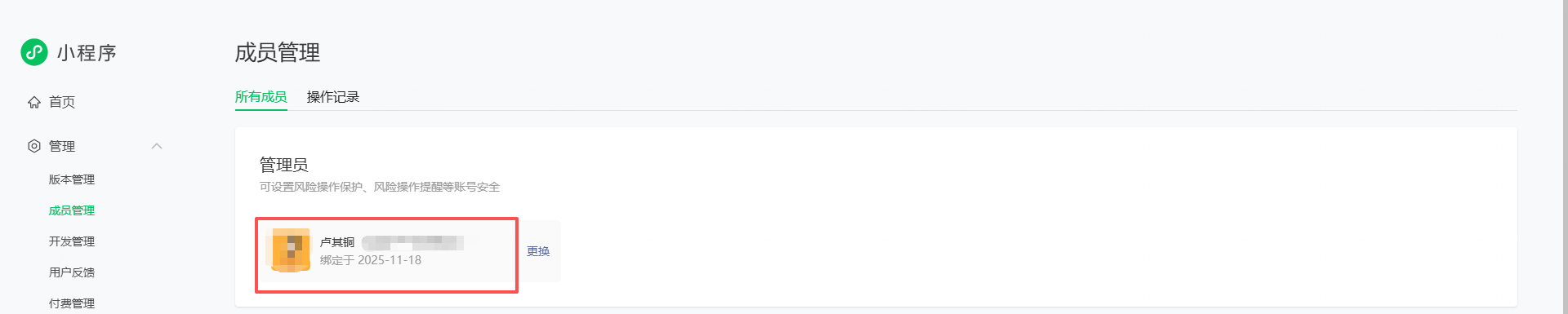 ② 若需修改小程序管理员:登录小程序MP后台【成员管理】进行修改管理员信息
