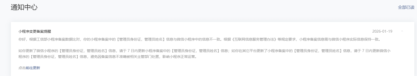 小程序信息需与小程序备案信息一致,如不一致,建议尽快发起变更备案操作,避免因备案信息不准确被相关主管部门处置,影响小程序正常运营。