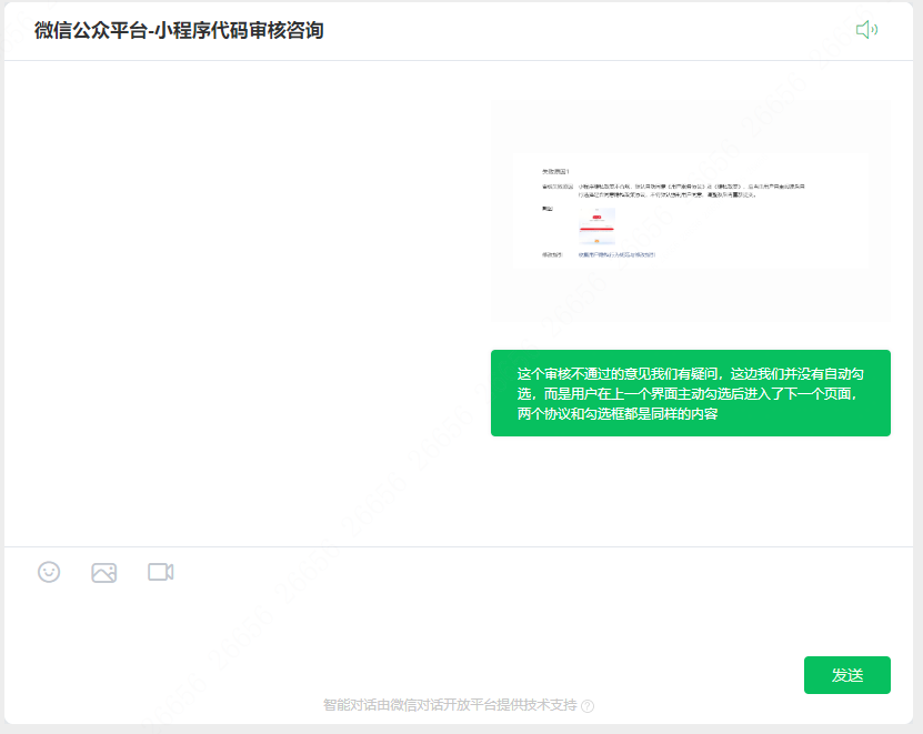 这个审核不通过的意见我们有疑问,这边我们并没有自动勾选,而是用户在上一个界面主动勾选后进入了下一个页面,两个协议和勾选框都是同样的内容