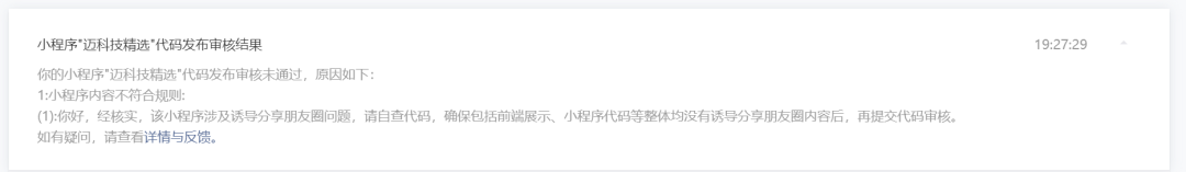 今天上传的版本中,审核说有涉及诱导分享到朋友圈的问题,我们自查代码都没发现“朋友圈”三个字。。。想问一下具体是哪里出现了问题,我们好进行改进,谢谢~~