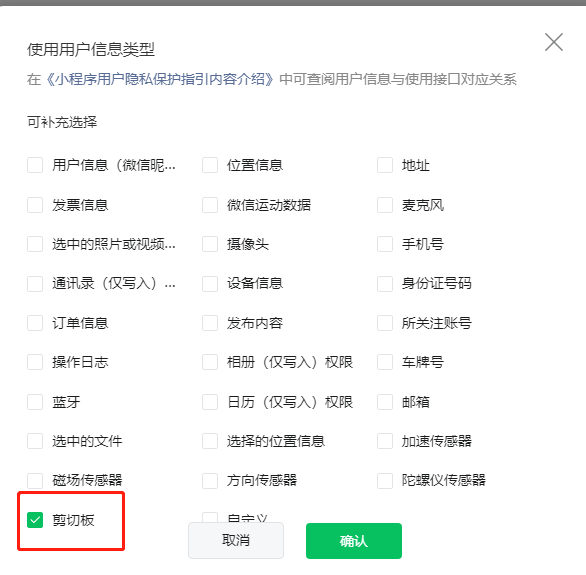 Object {errMsg: "setClipboardData:fail api scope is not declared in the privacy agreement", errno: 112}, 这是权限申请问题吗?去看scope列表,也没有对饮权限字段,在iphone里错,安卓正常使用