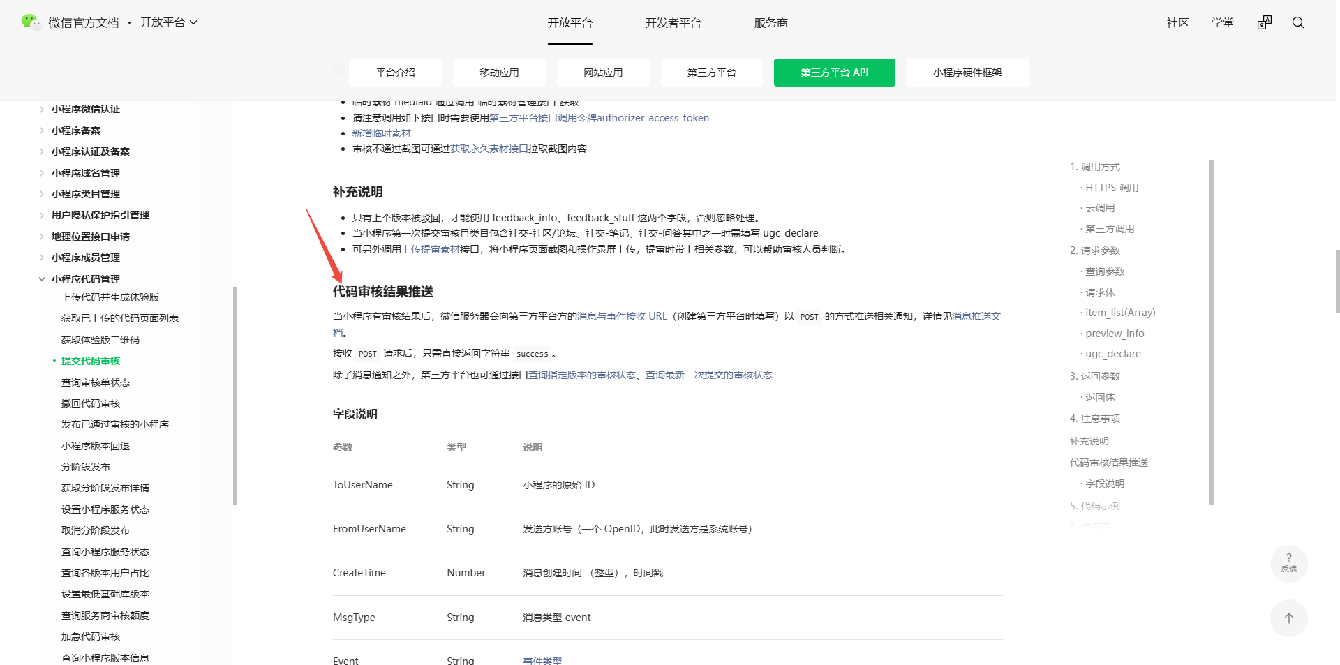 你好,会推送到第三方平台-消息与事件接收配置URL地址:https://developers.weixin.qq.com/doc/oplatform/openApi/miniprogram-management/code-management/api_submitaudit.html