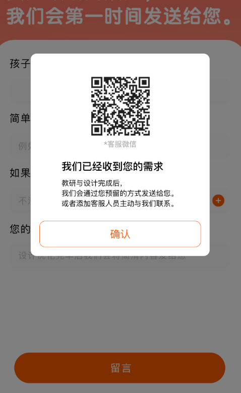 需要实现上述功能,用户点击留言,此时弹出信息,用户长按二维码,能添加客服二维码。