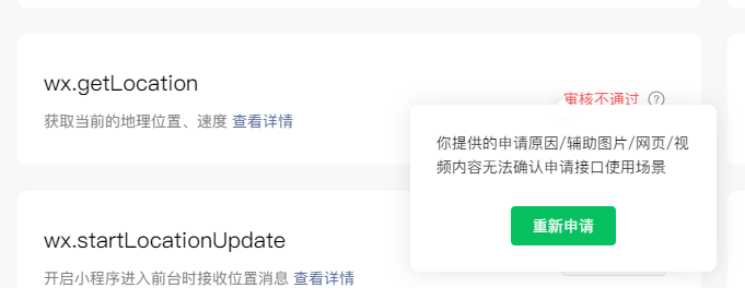你好,核实到小程序申请wx.getLocation接口审核不通过,根据提交的申请信息可知申请该接口是用于【辅助填写配送地址以及计算用户地址与门店之间的距离】,不符合wx.getLocation接口使用场景开放范畴。建议使用wx.getFuzzyLocation、wx.chooseLocation或wx.choosePoi、wx.chooseAddress接口实现上述场景。可参考相关案例解析:https://developers.weixin.qq.com/community/develop/doc/000646718d40a08a65ed1e2175bc09
