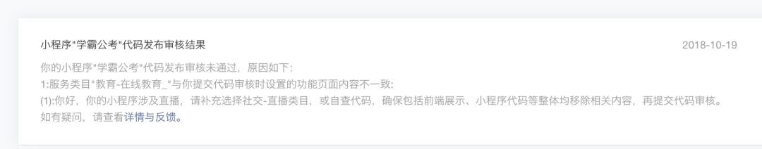你好,经核实,贵方小程序涉及课程直播回放等视频内容,需补充文娱-视频类目,或请自查代码,确保包括前端展示、小程序代码等整体均移除:直播内容和功能,再提交代码审核。